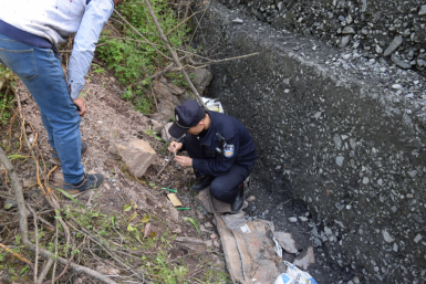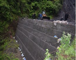 1.事故发生地点位于通江县铁溪镇罗村煤矿+713矸石场下方雨水收集池(炸药库旁边),该雨水收集池口面呈矩形,长度18.1米,宽度1.9米,深度超2米;2.雨水收集池临边一侧为堡坎,高度约7.3米,堡坎不完全垂直,堡坎坡面呈台阶式,堡坎顶边与雨水收集池长边之间形成一狭长的平台,宽度约1.9米。3.坠落点位于堡坎底部,堡坎底部呈不规则地面,在堡坎底部石头及废旧纸箱上,有红色血样痕迹。4.坠落点堡坎上顶面区域有建筑材料和工具:一辆斗车、一堆沙子、四袋水泥、两把铁铲,雨水收集池临边未设置防护措施。