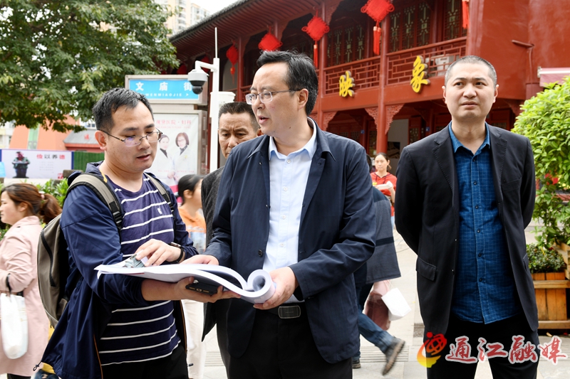 来到红军广场和文庙街,谭青松实地踏勘了项目实施进度,与设计单位、施工单位和业主单位现场逐一研讨改造升级的整体氛围和部分细节。