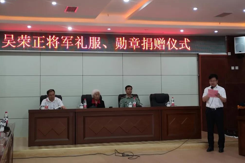 吴荣正将军小女儿吴樱花代表母亲高秀茹致辞,她表示,今年恰逢我们党建党一百周年,在这个特殊的日子里,我和我的孩子们决定,将我丈夫、孩子们的父亲吴荣正将军留下的革命文物,1955年授衔时的礼服及三枚勋章,无偿捐赠给他的故乡,这是一个不舍的决定,但这也是一个正确的决定,我们一致相信,这是这批革命文物最好的归宿。