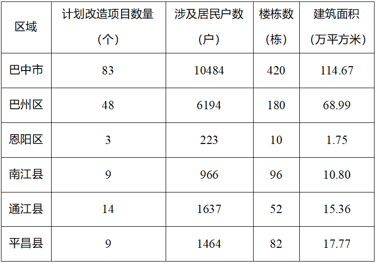 2025年,巴中市计划实施城镇老旧小区改造项目83个,涉及居民10484户,楼栋420栋,总建筑面积114.67万平方米。