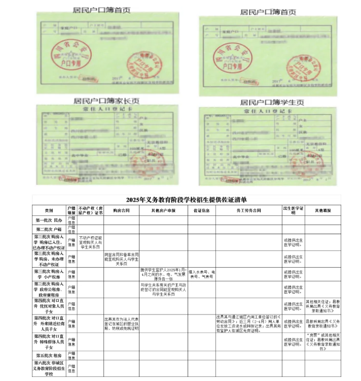 第一批次 民办学校:提供监护人居民户口簿首页和家长页;学生居民户口簿首页和学生页。