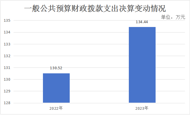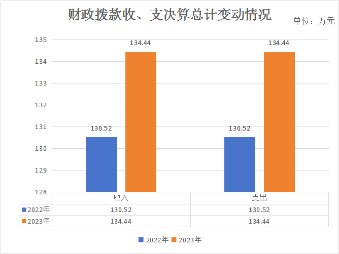 2023年度财政拨款收、支总计均为134.44万元。与2022年度相比,财政拨款收、支总计各增加3.92万元,增长3%。主要变动原因是2023年人员变动,人员经费增加。